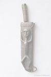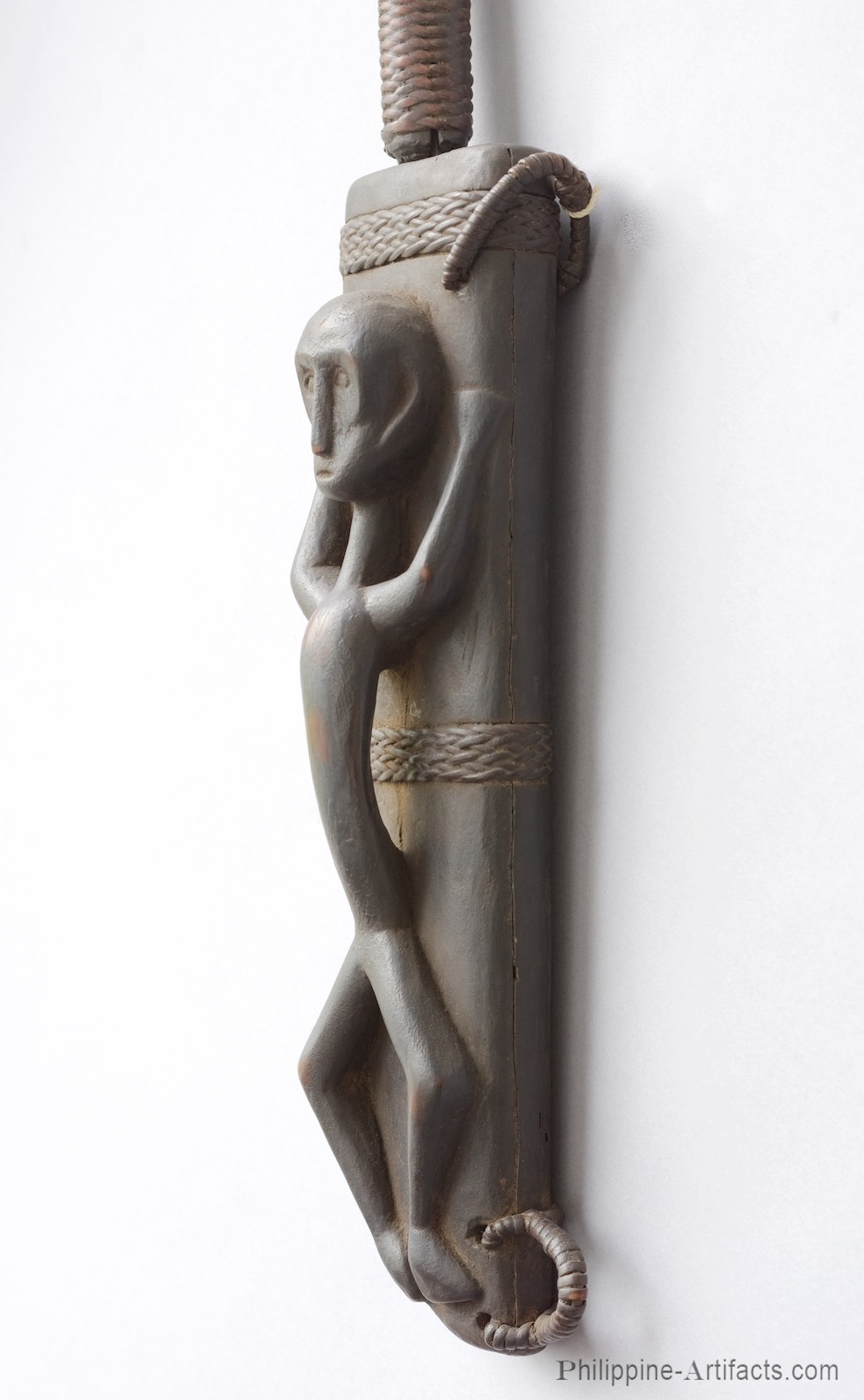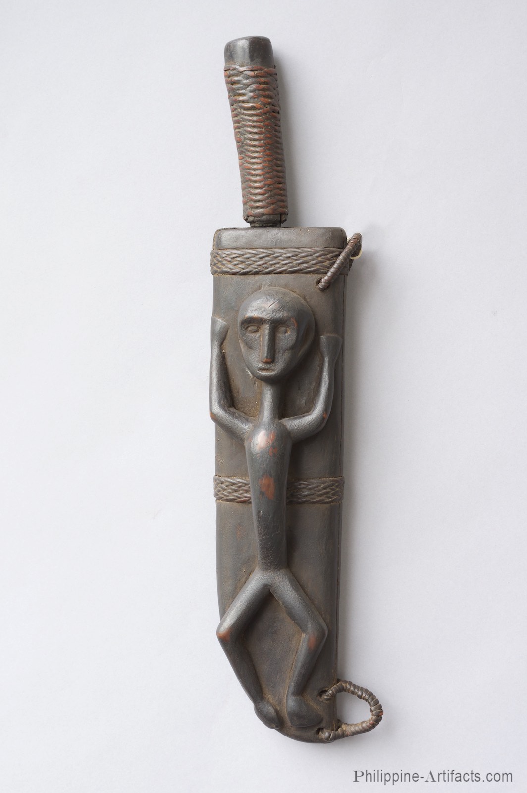 106 Ifugao knife or "bolo" with fine carved wood scabbard, 37 cm long, showing a figure of an arched man with outstretched arms carved in deep relief.