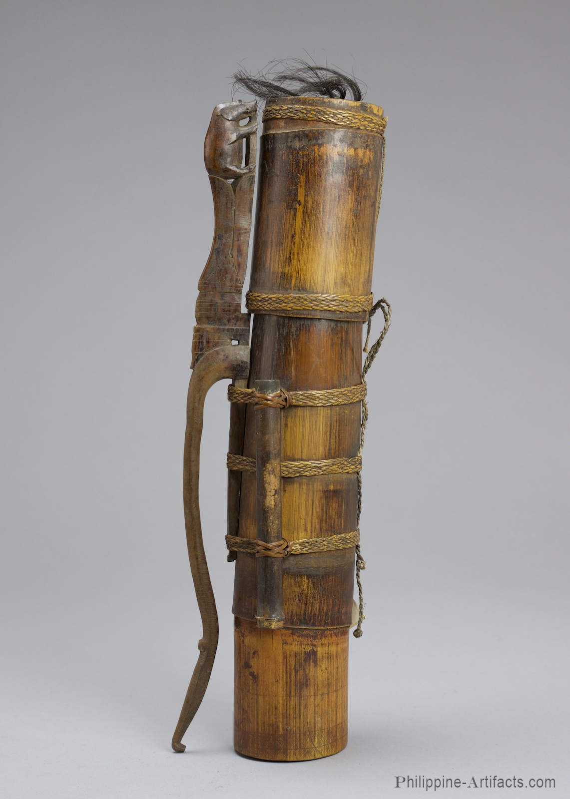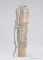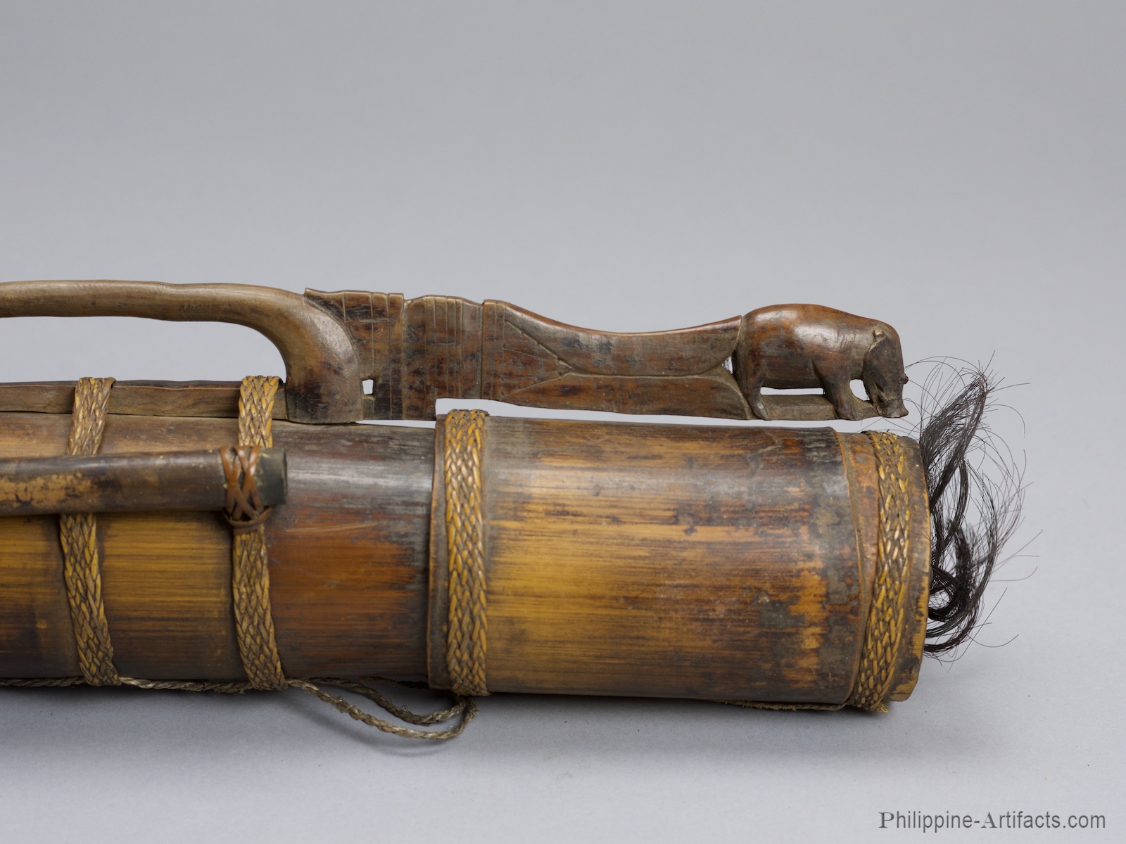 107 Bamboo quiver for darts used in a blowgun, from Palawan, 48 cm (19") long. Such a quiver is called a "Karaban". It has several bands of finely braided rattan lacing and a carved wooded handle designed to be tucked inside a belt, with a figure of a wild boar, the favorite prey for hunters. A fine patina confirms its age. There are 7 bamboo darts inside. When these were prepared for use the tips were dipped in poison, but the darts in this quiver are all clean and unused, although they do have sharp barbed points. This quiver was made by the Tagbanua Tribe in Palawan Island, one of the oldest ethnic groups in the Philippines.