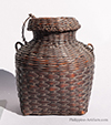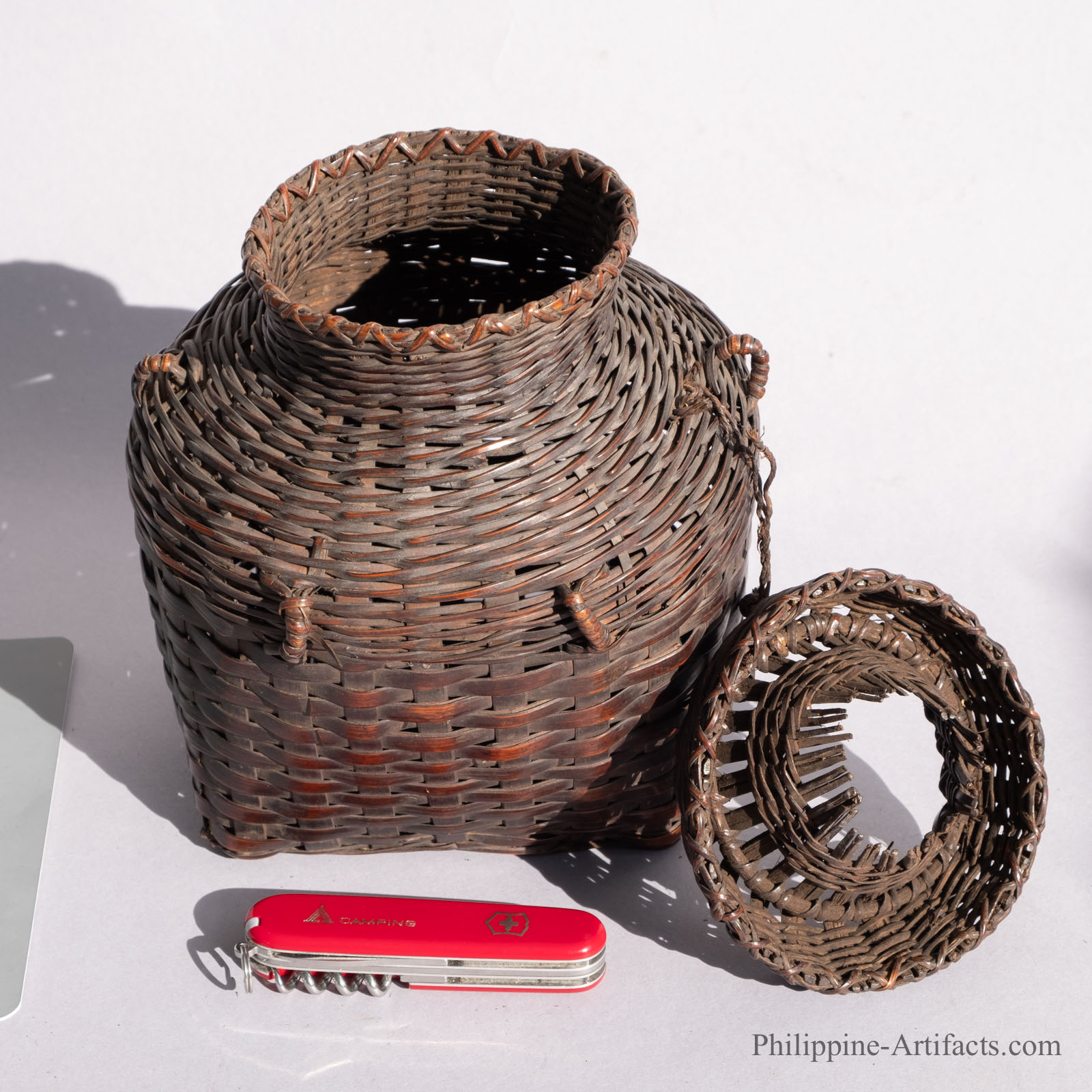 110 Rattan fishing creel basket, or perhaps a fishing trap. Size is 19 cm high, a bottle-shaped basket with separate trap lid that has thin bamboo spikes pointed inside to keep a small fish inside. It also has a few small fairleads so that it can be tied to a waist belt, or to hang from a shoulder strap. Purchased in Baguio in central Luzon in 1992.