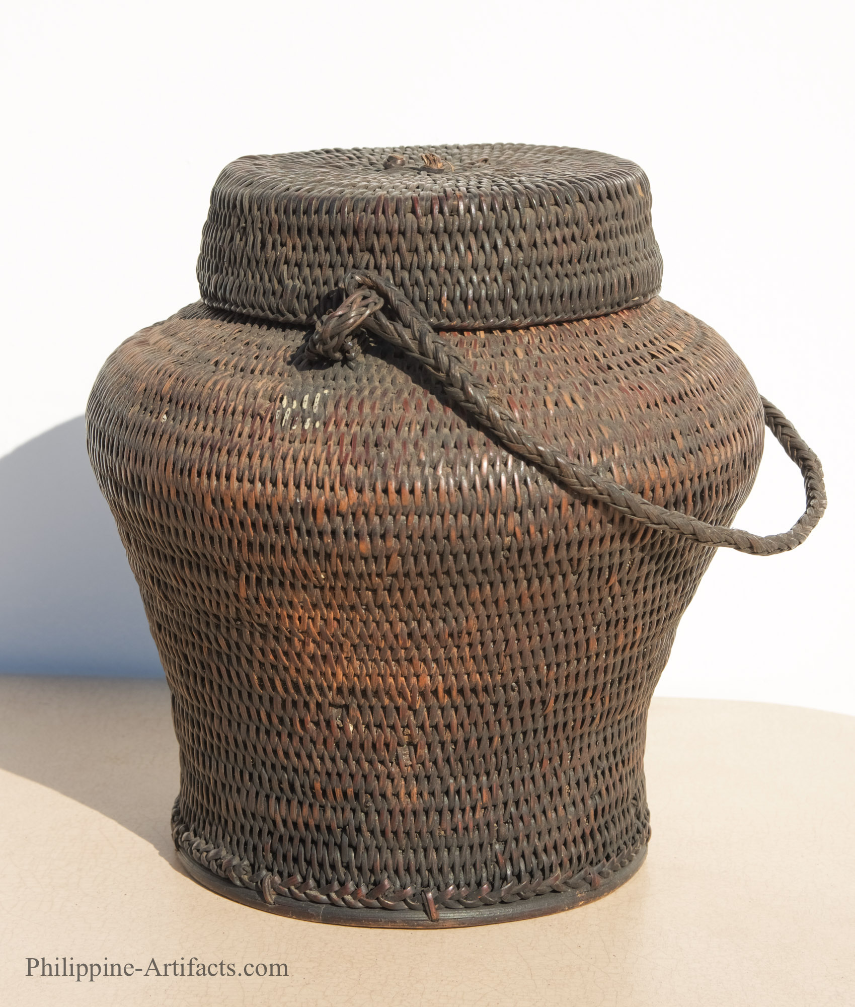 124 Round vase-shaped basket of coiled construction with a handle and top lid, 25 cm high. Such a basket, called an ulbung, was used to store a few days supply of hulled rice inside the house. The handle was used to hang the basket to keep it away from rodents. From Ifugao or Mountain Province and purchased in Sagada, Mountain Province, in 1993. (See Basketry of the Luzon Cordillera, Philippines, by the UCLA Fowler Museum, Catalogue number 5 and Fig. 1.13 show such baskets in-situ in an Ifugao house).
