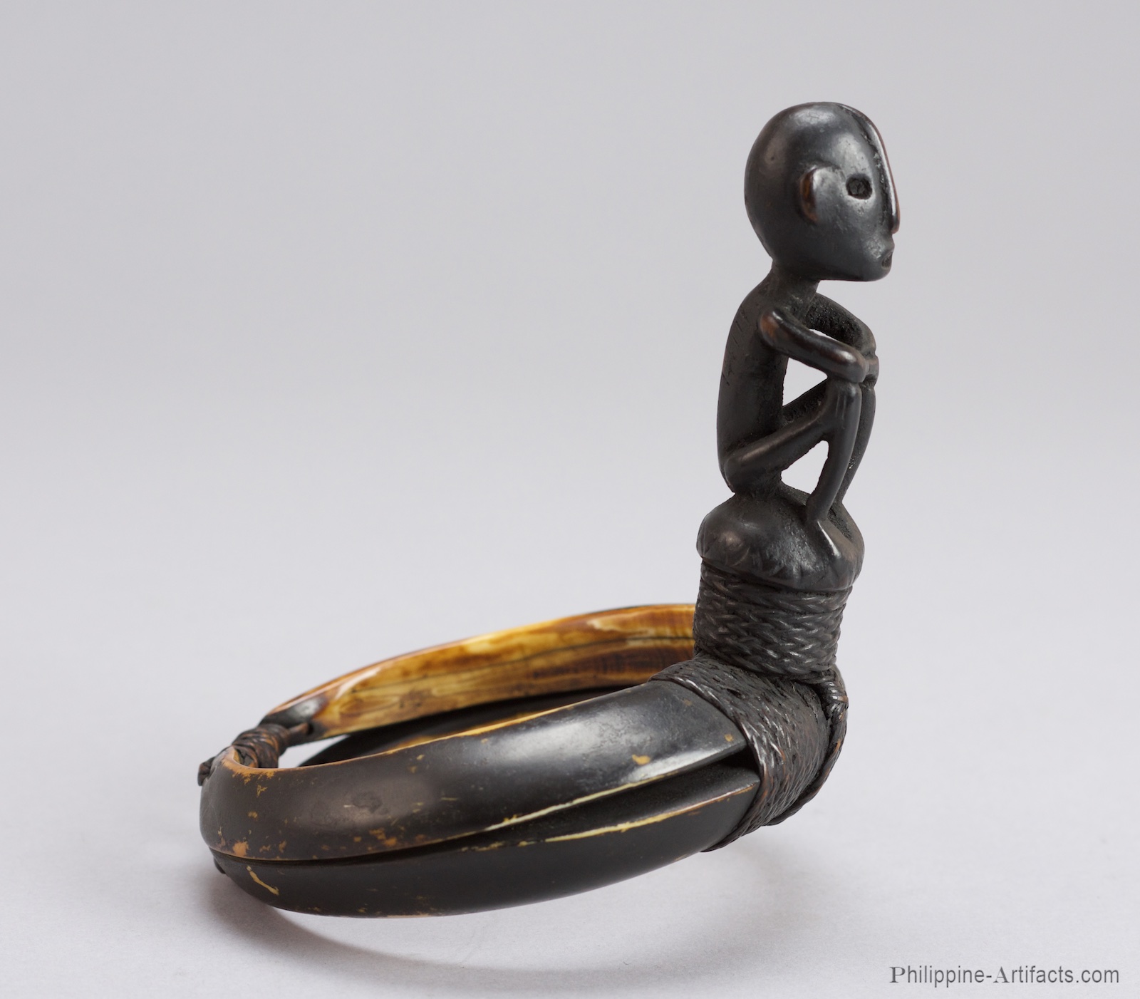 126 Armlet made of four boars tusks bound with basketry lashing, with a carved wood figure of a squatting man. 13.4 cm high and 13 cm dia. Such an armlet was worn by Bontoc men, above the elbow, during dances for head-hunting ceremonies. (Cf. Casal, People and Art of the Philippines, p.246-247, also Anderson, Indigenous Art of the Northern Philippines, fig. 569 and 570)