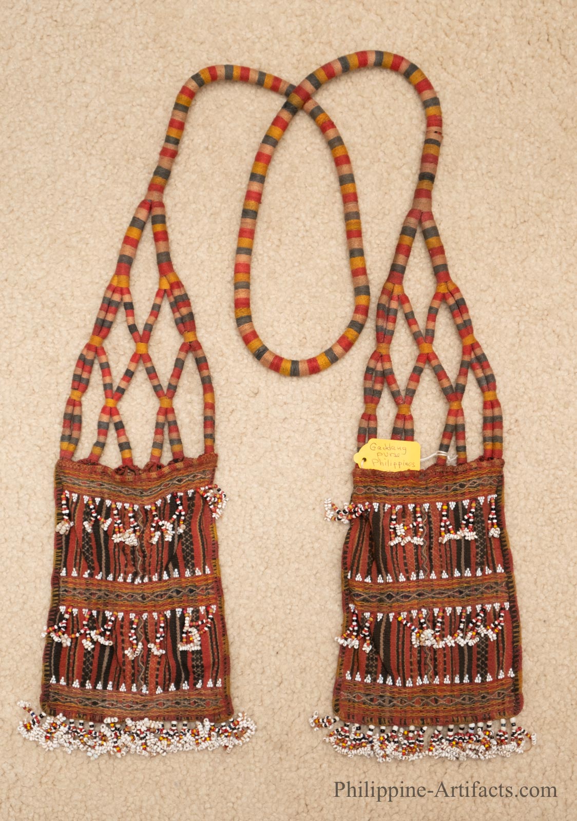 127 Two small identical cloth purses, each 19 cm high x 12 cm wide, of hand-woven red and black cloth decorated with beads, and attached together with a 90 cm long decorated cord. Worn by women for ceremonies and festivals. From Gaddang ethnic group, Cordillera region of Luzon, (eastern parts of Ifugao and Mountain province). (See Maramba, Form and Splendor, p 15 and 95; also Anderson, Indigenous Art of the Northern Philippines, fig. 429)