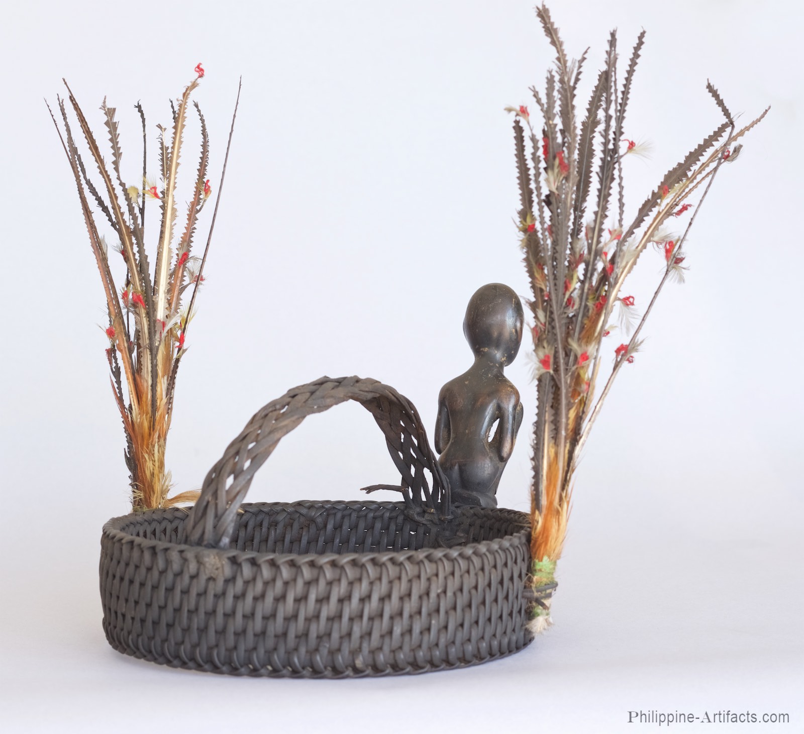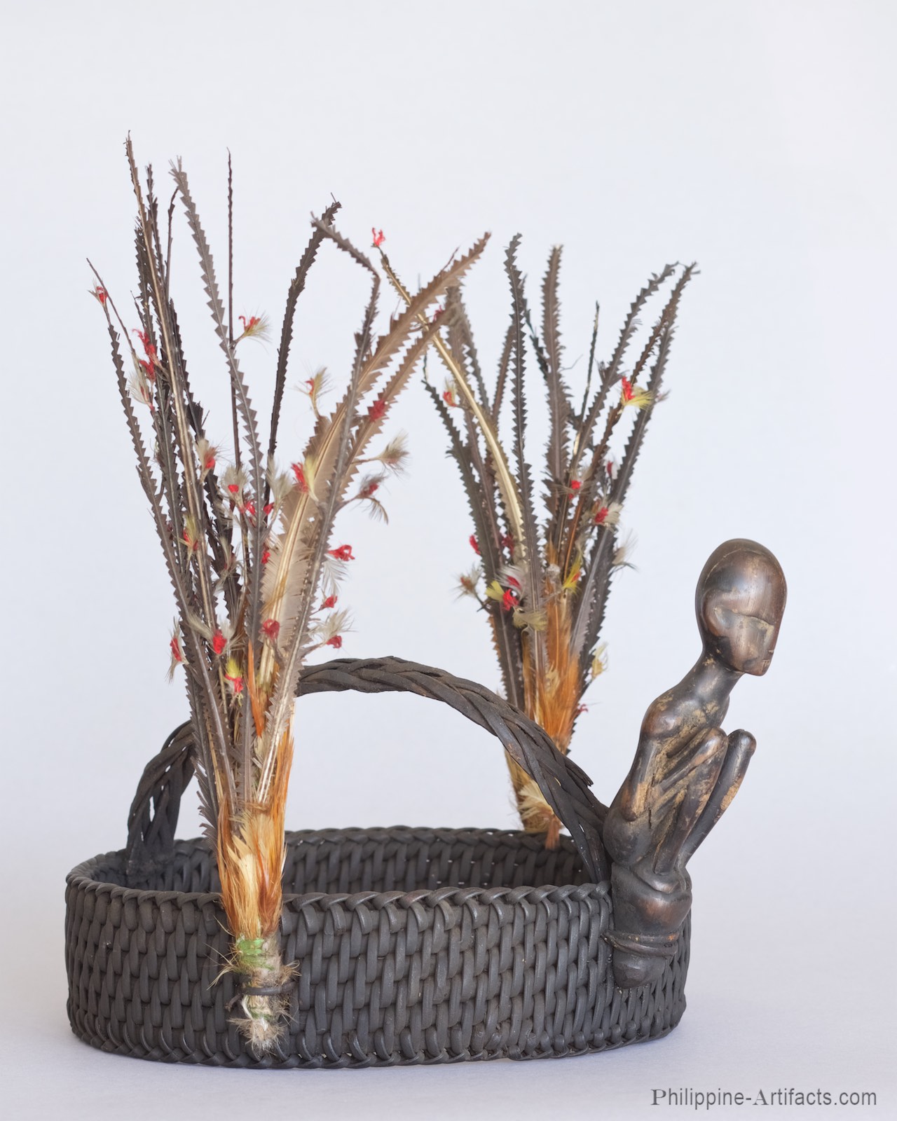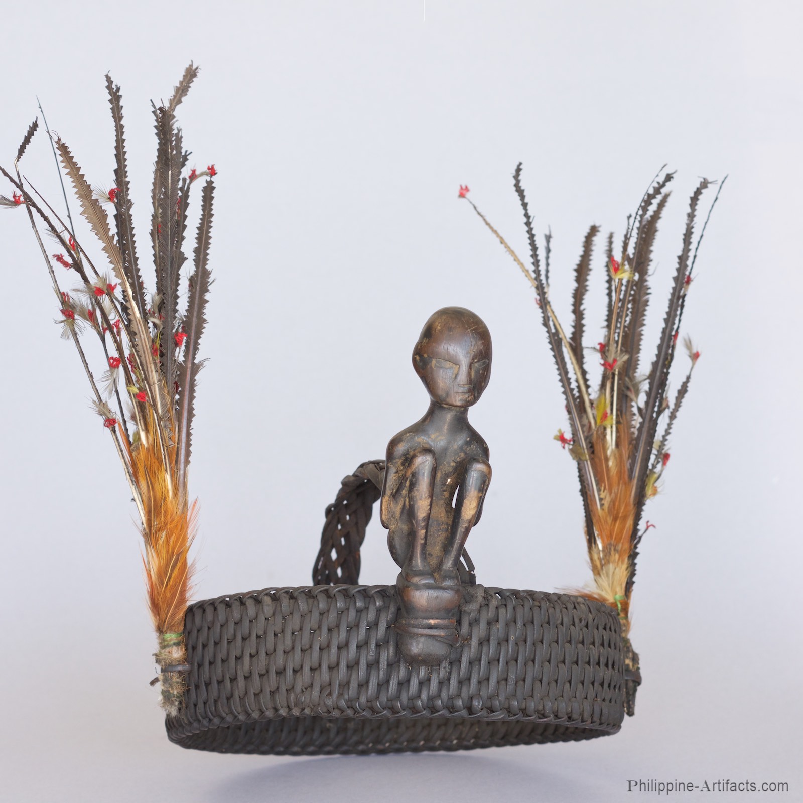 131 Ifugao headdress, with a rattan head band with coiled construction, 20 cm dia., and a wood figure of a squatting man, 14 cm high attached to the front, and two plumes of decorated feathers attached to the sides. This was used by a mumbaki, a local religious practitioner (shaman) at dances and ceremonies. Rudolf said this is an old headdress with an Ifugao carved figure, ca 1950. Registered as a Cultural Property by the National Museum of the Philippines, October 2003, with stamp 0084811, and estimated age ca 1970-80. (See Ellis, People and Art of Philippines, p. 241, for reference to a feathered headdress used by the Kalingas. Also see Anderson, Indigenous Art of the Northern Philippines, fig. 579 for another headdress with an anthropomorphic figure, that is described as a bridal headdress from Barlig, a small town in Mountain Province about 20 km NE of Banaue).