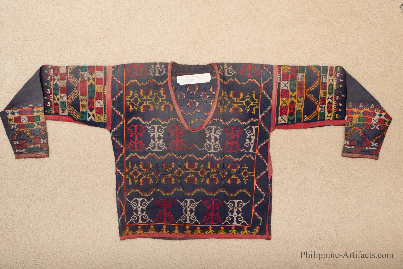 133 T'boli woman's shirt from Mindanao, 47 cm high. It has much embroidery on a dark blue (indigo-dyed) cotton shirt. The first and third row of images, counting from the bottom, seem abstract at first, but I think it is a clever design that shows the head of a woman at the top, then her neck and a straight wide line for her torso, with her elbows spread out and resting on her knees and her forearms and hands curled in. Below that she is sitting on the ground with her knees raised and legs spread out. The design is contrived to be symmetrical, and it can be viewed upside down also. It is a good example of abstract human figures in textiles. That was a tradition for textile designs of several different ethnic groups in Mindanao.