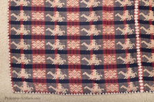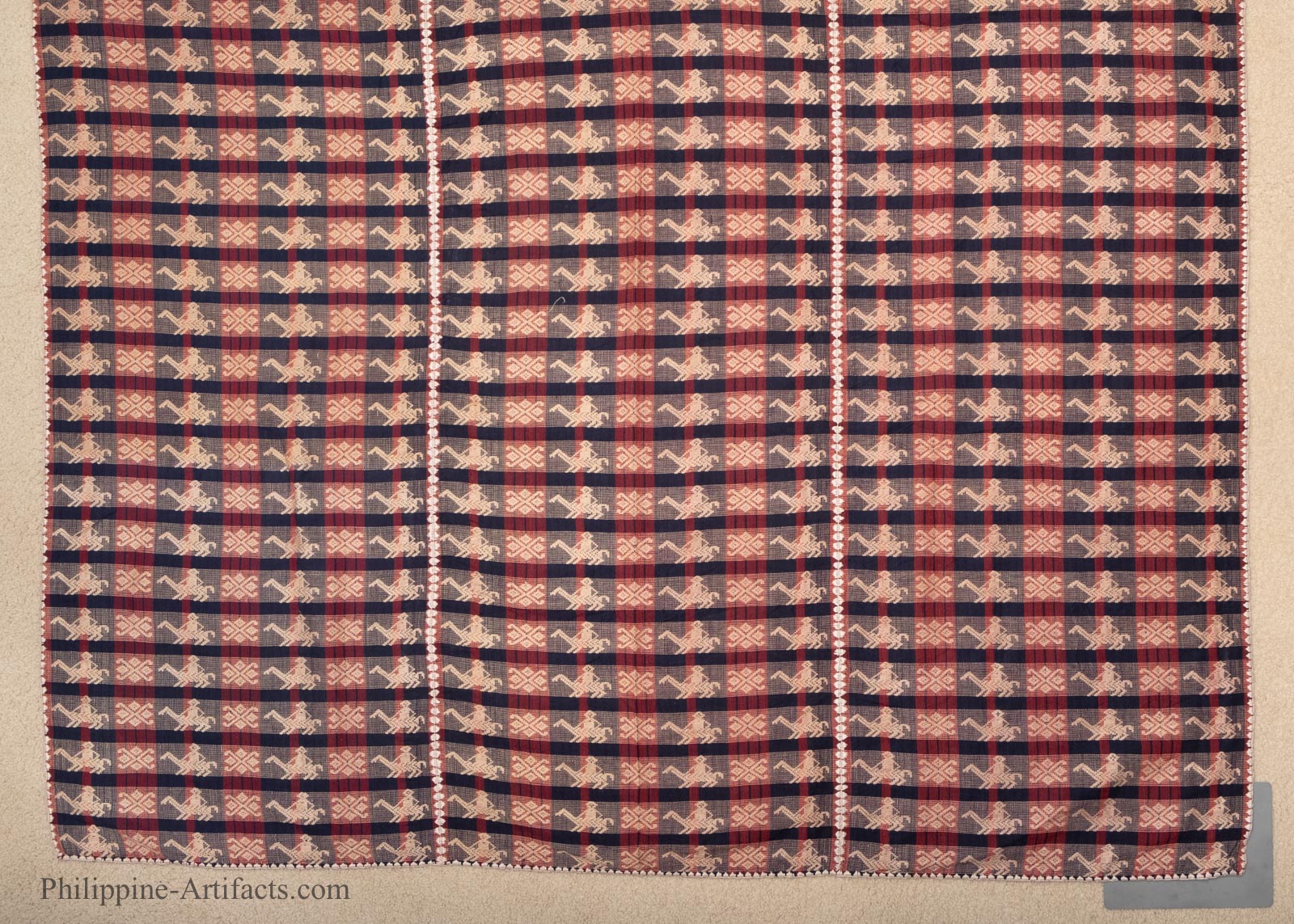 142 Tinguian blanket showing multiple small figures of horses with riders. Size is 206 cm long and 146 cm wide. The blanket is composed of three panels sewn together. Each panel was woven separately on a back strap loom with a supplementary weft technique for the figure designs in white on a red and blue background. From Tinguian (a.k.a. Itneg) ethnic group, Abra Province, northern Luzon. This blanket was used only for special ceremonies such as at funerals for display, but not as a shroud. For other examples and history see The Tinguian by Cole, 1922, p. 436 and plate 72; also The People and Art of the Philippines, by Casal et al, 1981, p.230-231; Fabric Treasures of the Philippines, 1989, p.15; and Anderson, Indigenous Art of the Northern Philippines, 2010, fig. 417)