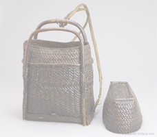 154 Ifugao rattan backpack with frame and shoulder straps, 30 x 16 cm wide, 41 cm high (not including the straps), old and used. Purchased in Manila in 1992. (Cf. Basketry of the Luzon Cordillera, Philippines, by the UCLA Fowler Museum, Catalogue No. 25 for a similar backpack from Mayaoyao town in Ifugao)