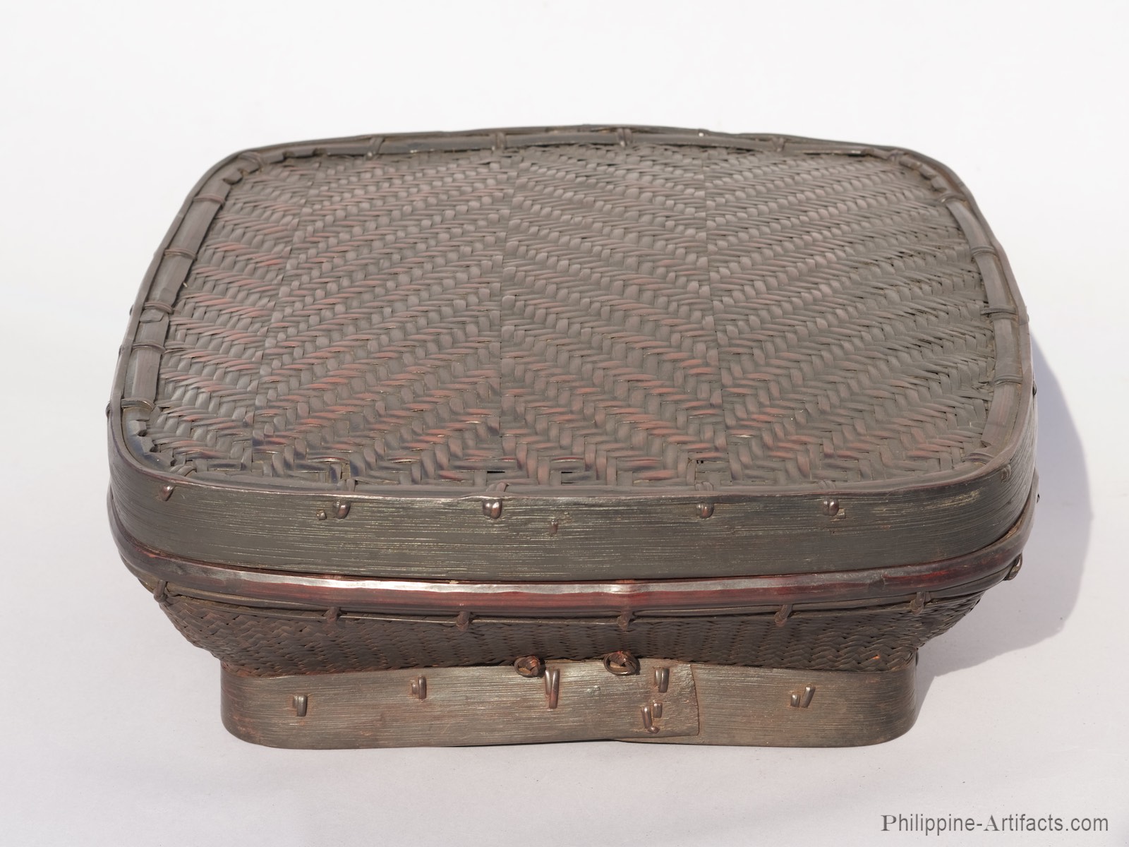 158 Household container with cover for cooked rice from Ifugao province. Since cooking takes place only once a day in the early morning, the uneaten portion is stored in this container so that it is available when more family members come in from the field and wish to eat. This is an unusually large and well preserved cooked rice basket, 41 cm square and 16 cm high, so it may have been used and reserved for special occasions to feed large groups for feasts, ceremonies, etc. (Cf. Basketry of the Luzon Cordillera, Philippines, Catalogue Number 8)