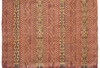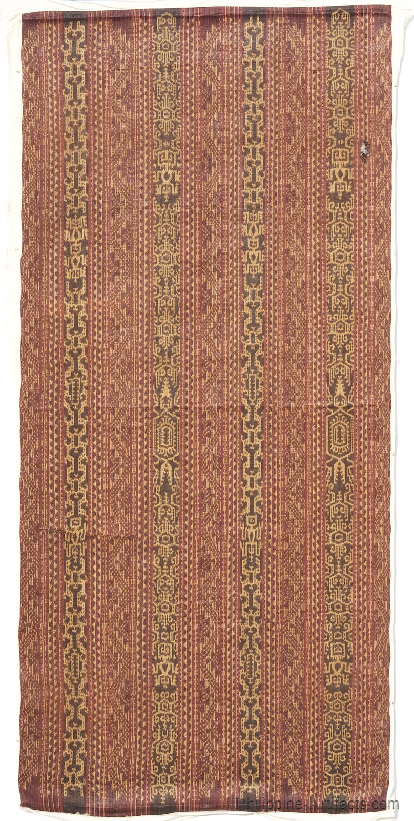 161 An abaca textile from the Blaan tribal group of Mindanao, with an intricate ikat design of anthropomorphic and other figures, 133 cm long and 62 cm wide. The stylized and abstract designs of human and animal figures of crocodiles and frogs are fascinating and include a variety of heads of human or spirit figures. Look for a pair of eyes on the outside edges of the black and white columns, then a nose in between with a snout or flaring nostrils and a mouth below that, and sometimes a human body below that, other times just the head. The figures are often hidden in the pattern and easily overlooked by those not initiated or acquainted with these ancient forms of graphic code. Do they represent ancestor spirits, or guardian spirits, or threatening spirits? Often the weavers are not even sure anymore; but they remember that these were the traditional designs for heirloom ikat textiles that have been passed down for many generations. (See From the Rainbow's Varied Hue, Textiles of the Southern Philippines, by Hamilton, 1998, fig. 1.39 and 2.25 for similar Blaan textiles). Ikat textile designs of this type were also traditional among the Dayak in Borneo and in other regions of SE Asia, and they managed to resist the encroachments of modern civilization and the vigilance of Catholic and Muslim priests in stamping out all pagan customs related to spirit worship, due to the remoteness of these tribal communities and the obscurity of their sacred images.