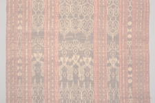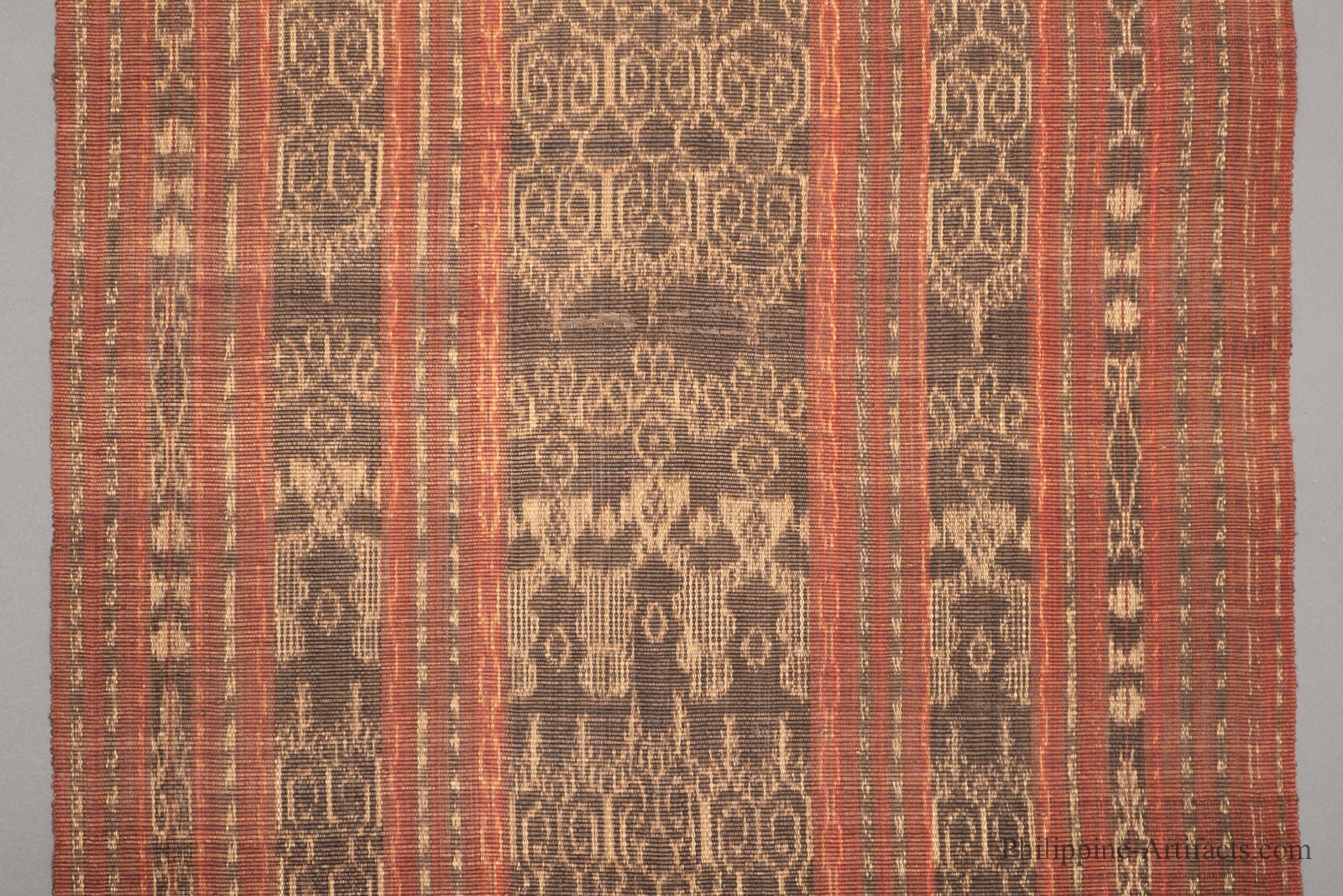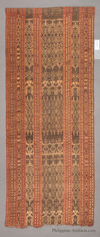 163 Abaca tapestry cloth, 66 x 163 cm, with ikat designs, from the Mandaya tribe in Mindanao. This is called a Dagmay cloth. It is an old textile. The warp yarns are worn and broken in a few places but the weft yarns are still intact there and hold it together. The ikat designs include several anthropomorphic figures, some crocodile/human figures in the middle, and several types of spirit faces. The longer you study it, the more you will discover. The human figures with legs spread wide symbolize a woman giving birth, and the newborn baby is the small circle in between her legs. This is often called an Abaca "birthing cloth" by those who know this association. Such a cloth is used as part of an exchange at marriage, and when a woman gives birth, it is considered conducive to safe delivery to use it as a covering. The wavy lines and curlicues in the motifs in the row above these women also represent humans, in much more abstract form. In addition they can be viewed as spirit faces. The ikat dying and then weaving of such a cloth takes about three months of part-time work. See The People and Art of the Philippines, by Casal et al, 1981, p.134-137.
