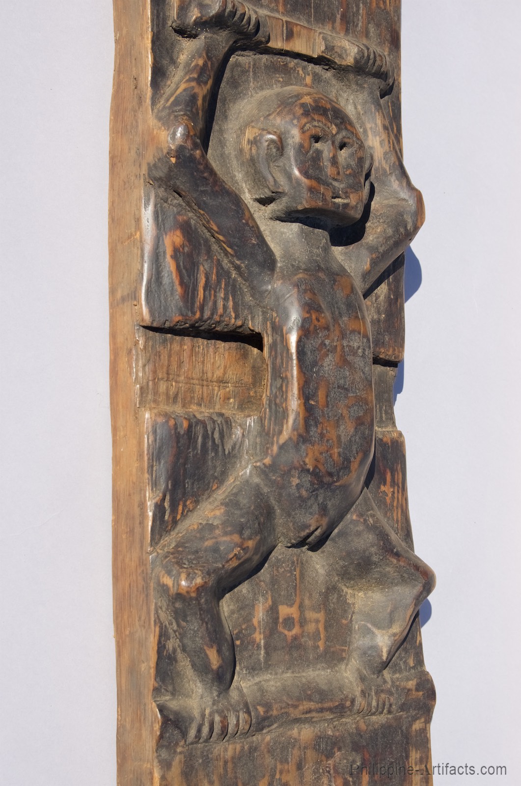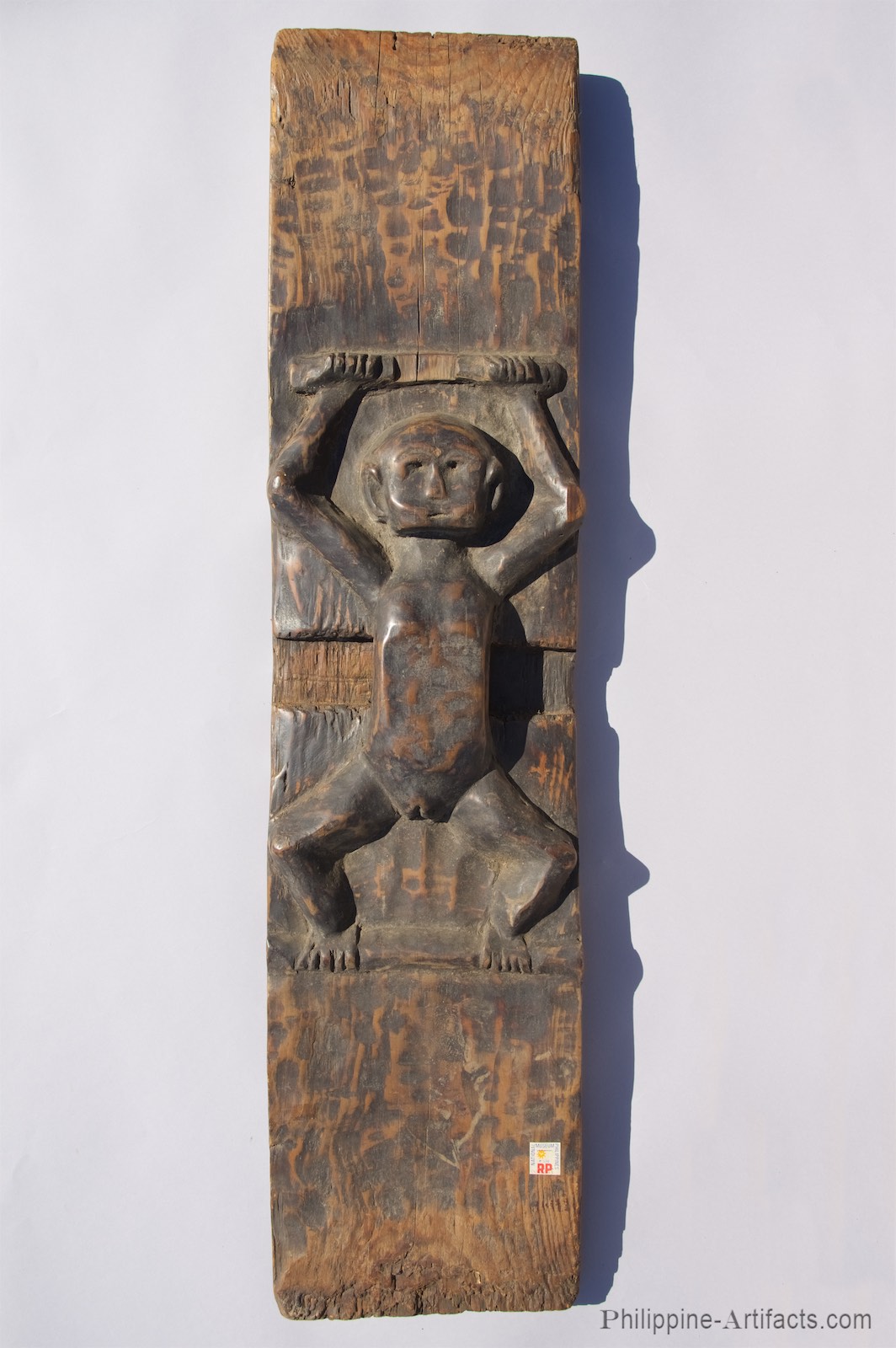 73 Granary door panel, 108 cm high and 25.5 cm wide, showing a female figure carved in deep relief with legs and arms spread apart (in birth position?), and slot for wood door bolt in middle. Native name is "Pamadingan". This was used by the Kankanay ethnic group as part of the doorway for a rice granary hut. Registered as a Cultural Property by the National Museum of the Philippines, with stamp 0065843, ca. 1975, from Bontoc region in Mountain Province. (See Casal, The People and Art of the Philippines, 1981, fig 256; and Anderson, Indigenous Art of the Northern Philippines, fig. 317 and p. 199).
