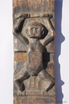 73 Granary door panel, 108 cm high and 25.5 cm wide, showing a female figure carved in deep relief with legs and arms spread apart (in birth position?), and slot for wood door bolt in middle. Native name is "Pamadingan". This was used by the Kankanay ethnic group as part of the doorway for a rice granary hut. Registered as a Cultural Property by the National Museum of the Philippines, with stamp 0065843, ca. 1975, from Bontoc region in Mountain Province. (See Casal, The People and Art of the Philippines, 1981, fig 256; and Anderson, Indigenous Art of the Northern Philippines, fig. 317 and p. 199).