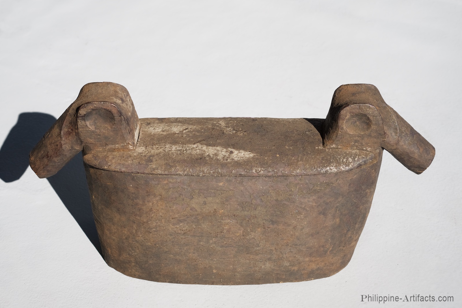 82 Carved box container, 50 cm W, 25 cm H, with stylized pig-head handles at ends. This box contains paraphernalia used by Ifugao priests to perform rituals invoking spiritual assistance. Banaue region, ca 1950