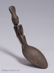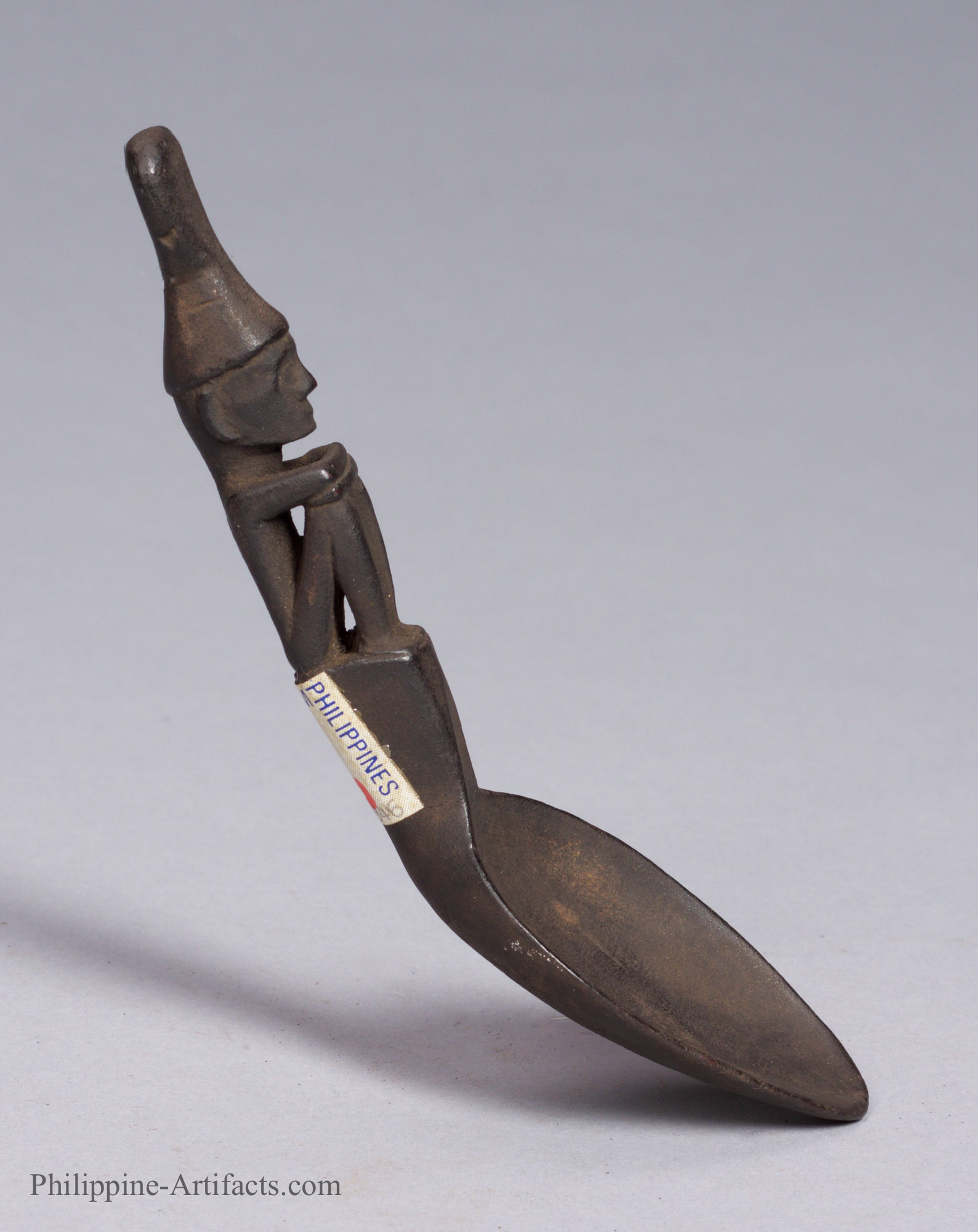 95 Ifugao spoon with figure of a squatting man on the handle with the same posture as a bulul; top of handle is flat, 19 cm long. Registered as a Cultural Property by the National Museum of the Philippines with stamp 0065846 and estimated date of ca.1930. This may be the oldest Ifugao spoon in my collection. For other examples see The People and Art of the Philippines, by Casal et al, 1981, p.208 - 211. Purchased in 1999 in Banaue.