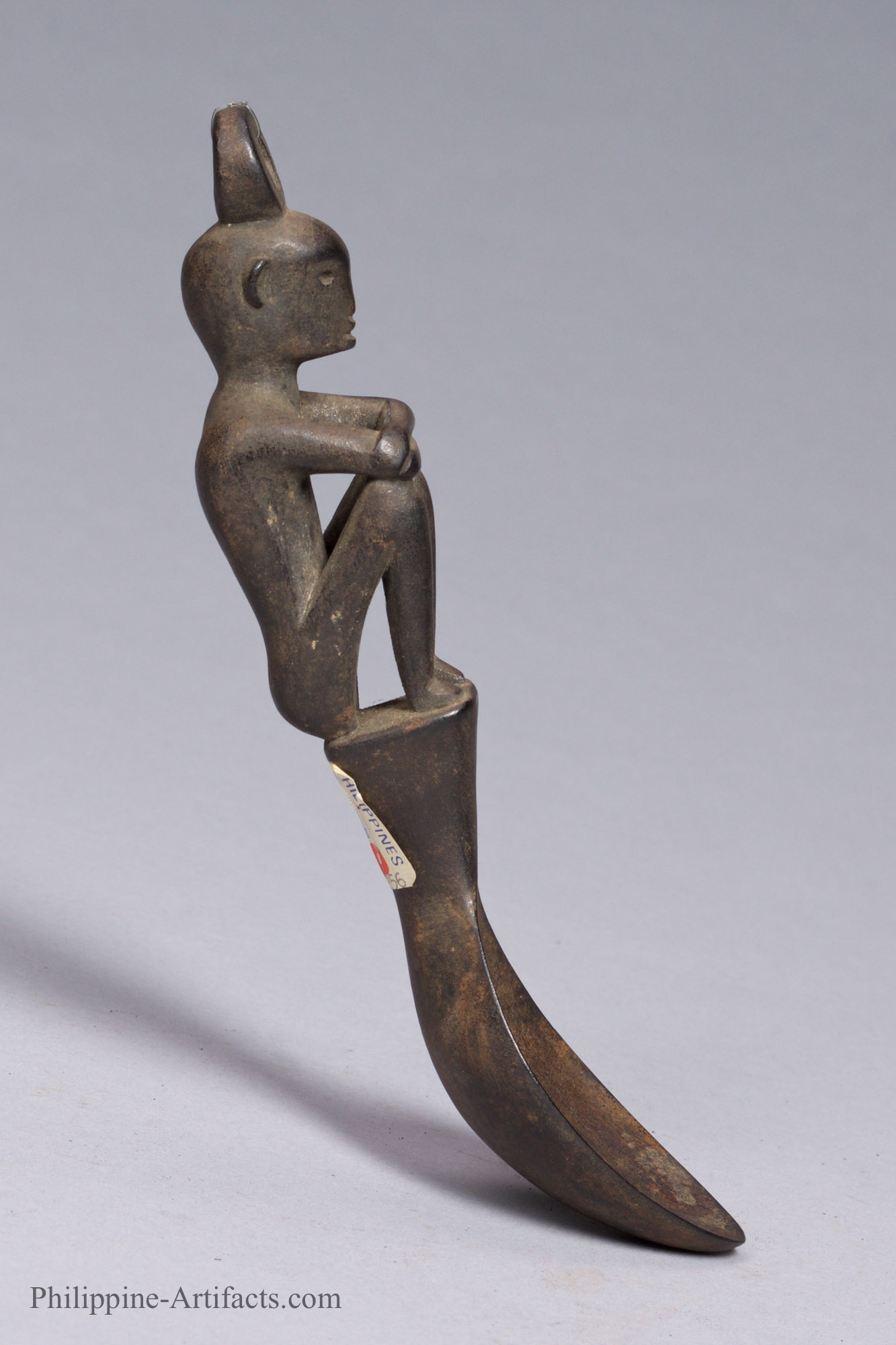 98 Ifugao spoon, 22.8 cm long; the handle with figure of a squatting man in the same posture as a bulul. This is very nicely carved and has a good antique patina. Registered as a Cultural Property by the National Museum of the Philippines with stamp 0069256. See Philippines, Archipel des échanges by de Monbrison & Alvina, 2013, fig 116 for a similar Ifugao spoon estimated to date from the 18th to 19th century.
